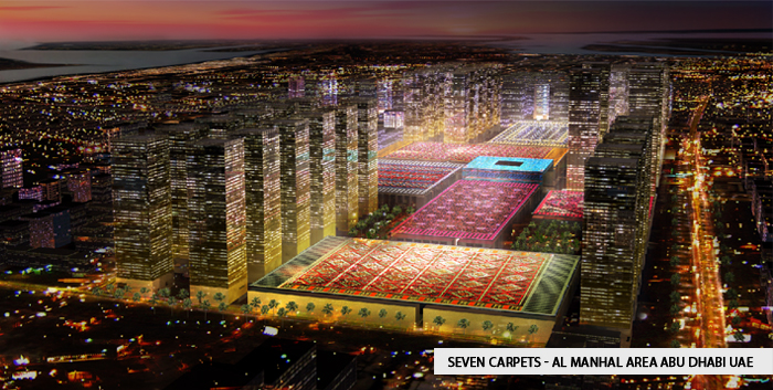 Project Description: The project involves a big area in the center of Abu Dhabi (6,620,940 sq. ft, approximately 61.51 hectares) that is currently used for various purposes. The program involved a feasibility study to examine the best use of the area, considering its central location and its potential transformation. The various facilities are located in uniform functional areas centered around the large volume of the covered plaza, which is the entrance to the urban system. In turn, these areas are arranged around broad open spaces whose outlines are characterized by this fragmented layout. This complex of solids and voids is covered by a reticulated structure with a geometric design that evokes the patterns of Oriental rugs, generating a block characterized by seven carpets. Thus, the block effectively becomes a large room within the urban structure of Abu Dhabi.
